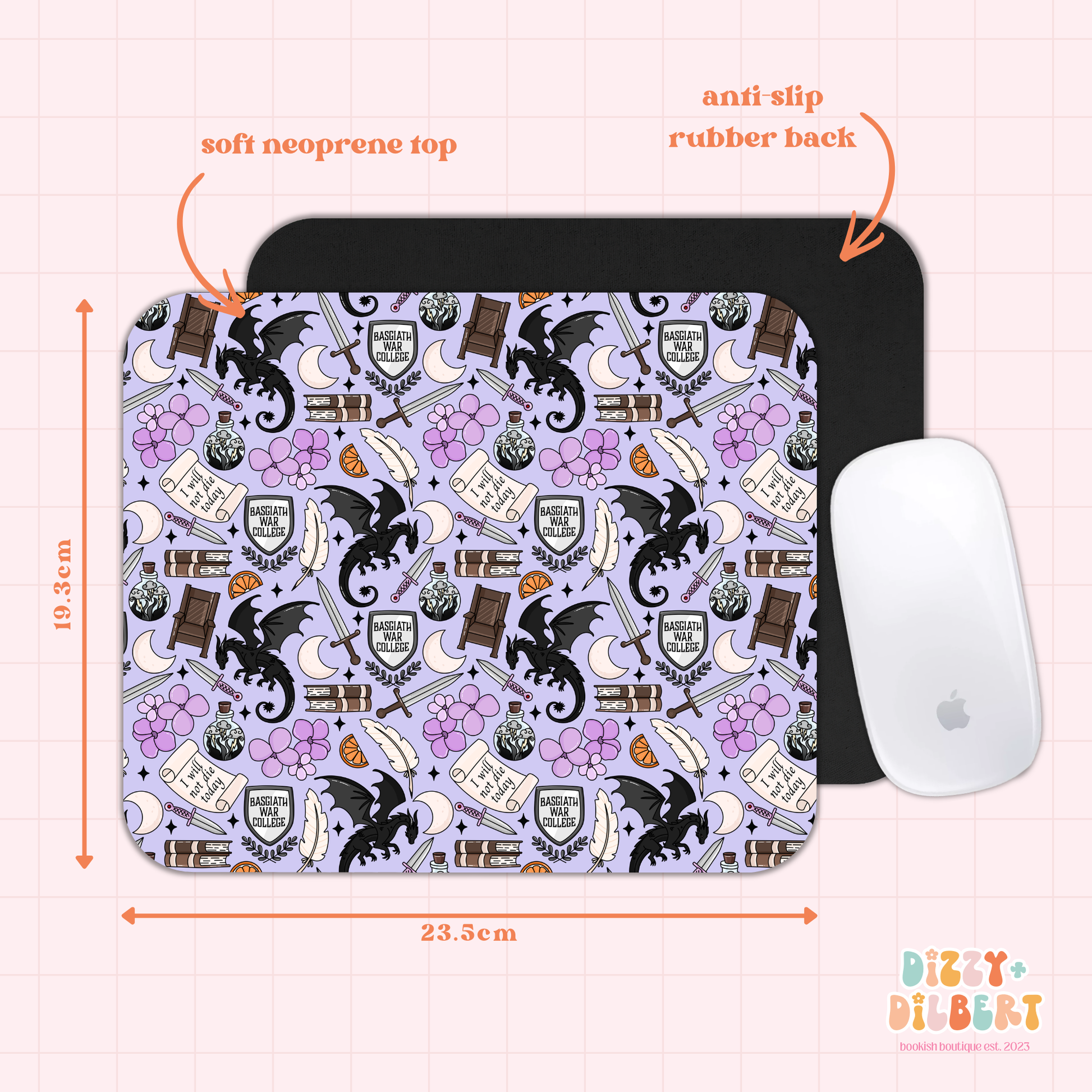 keywords: mouse pad, neoprene mouse pad, anti-slip mouse pad, rubber backing mouse pad, desk accessories, cute desk setup, home office essentials, office desk decor, study desk essentials, gift for gamers, bookish desk decor, fourth wing inspired, the empyrean series, iron flame, onyx storm, violet sorrengail, xaden riorson, tairn andarna sgaeyl